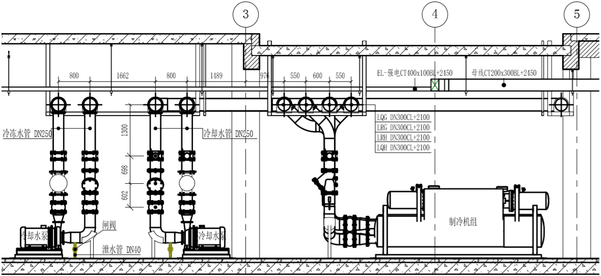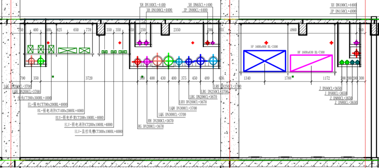 地下室机电管线的特点为,系统复杂,各各系统的主干管线在本层都有。管线不同系统之间交叉,同一系统之间互相交叉比较严重。局部复式停车位净高要求较高,管线只能在车道上方布置。首先对所有的机电管线进行系统的分类,对同一类型路由差不多的管道尽量综合在一起。我们把给排水的有压管道综合在一起,去往不用区域的桥架分两排布置,空调风与空调水同路由综合在一起,这样使得在车道上方的管线更加的规矩合理,避免互相交叉,施工方便。