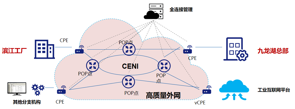 项目应用高质量工业外网、FN-IND工业互联网赋能平台,对公司滨江制造工厂进行工业互联网升级改造。计划在滨江工厂通过边缘网关连接各生产设备,通过高质量外网联通九龙湖科技园。在九龙湖科技园部署FN-IND工业互联网赋能平台,在工业互联网平台上实现智能制造相关的生产管理各类应用。通过数据融合,充分展示数字化、模块化、可视化、信息化、智能化等特色功能。