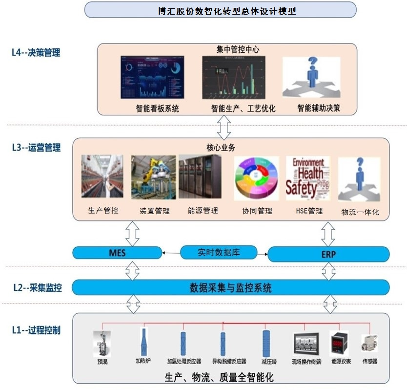 博汇股份数智化转型的规划目标是建成中国一流的特种油品细分领域的龙头企业,成为全球特种高端油品原料供应商,符合绿色石化智能制造的模式。通过总体设计、工程设计、工艺流程及布局,物流、能流、物性、资产等全流程数据采集和监控,引进关键化工智能制造装备、智能控制系统和制造执行系统、企业资源计划系统、实时数据库系统、物流一体化系统等智能软硬件系统,并通过工厂内部通信网络架构和互联互通信息集成的技术方案,实现数字化设计、智能化生产、安全化管控、数字化管理、绿色化制造的目标,确保未来10-15年保持先进性及成为行业标杆。