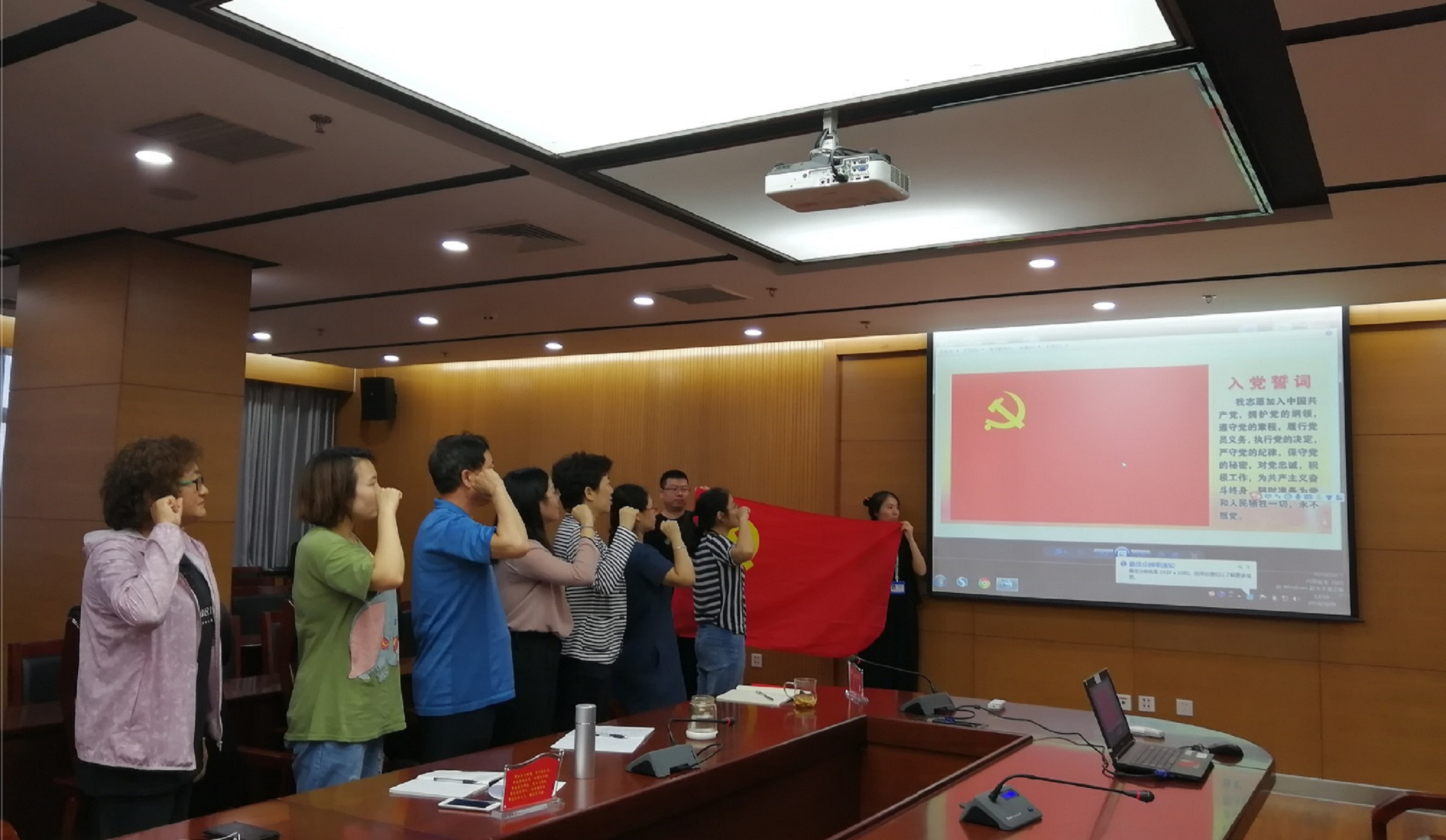 而后,由许滔同志领誓,支部全体党员在党旗前重温入党誓词。