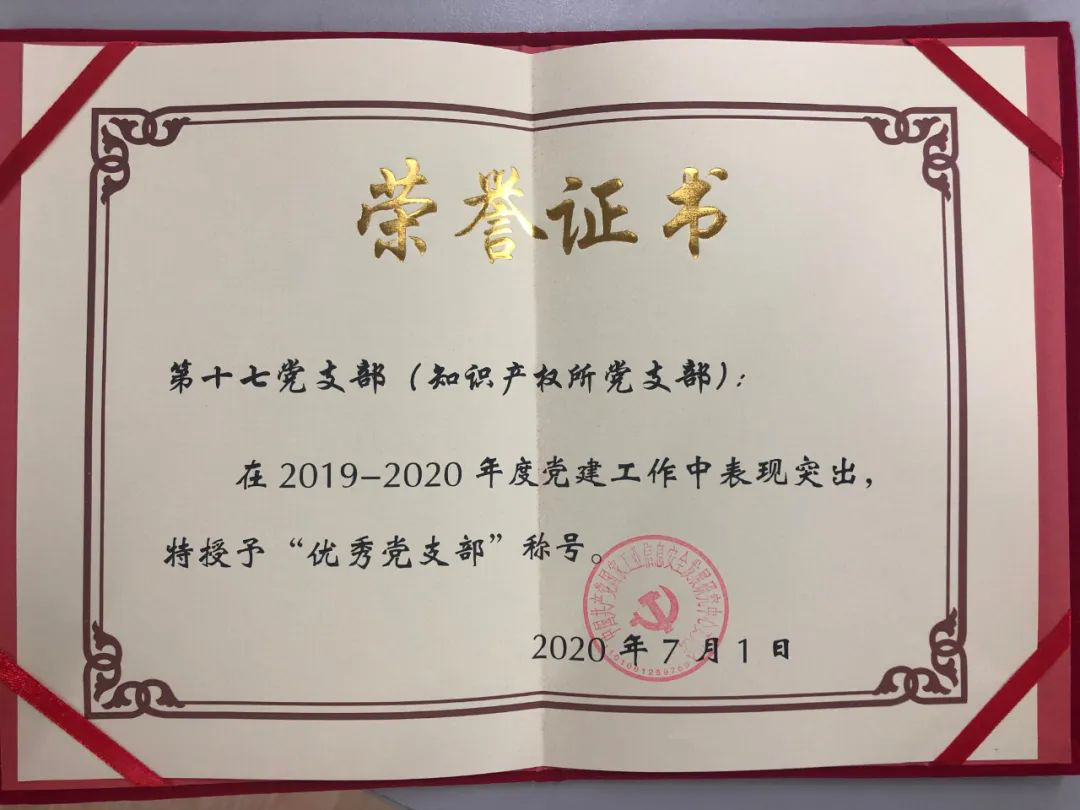 第十七党支部(知识产权所党支部)全体党员重温入党誓词,分享党员先进事迹与个人心得感悟,书写贺卡并录制祝福视频,表达了对党的坚定忠诚和深情祝福。第十七党支部今日荣获2019-2020年度“优秀党支部”荣誉称号,全体党员深受鼓舞,纷纷表示,将继续在支部委员会的带领下,全力做好支部的各项工作。