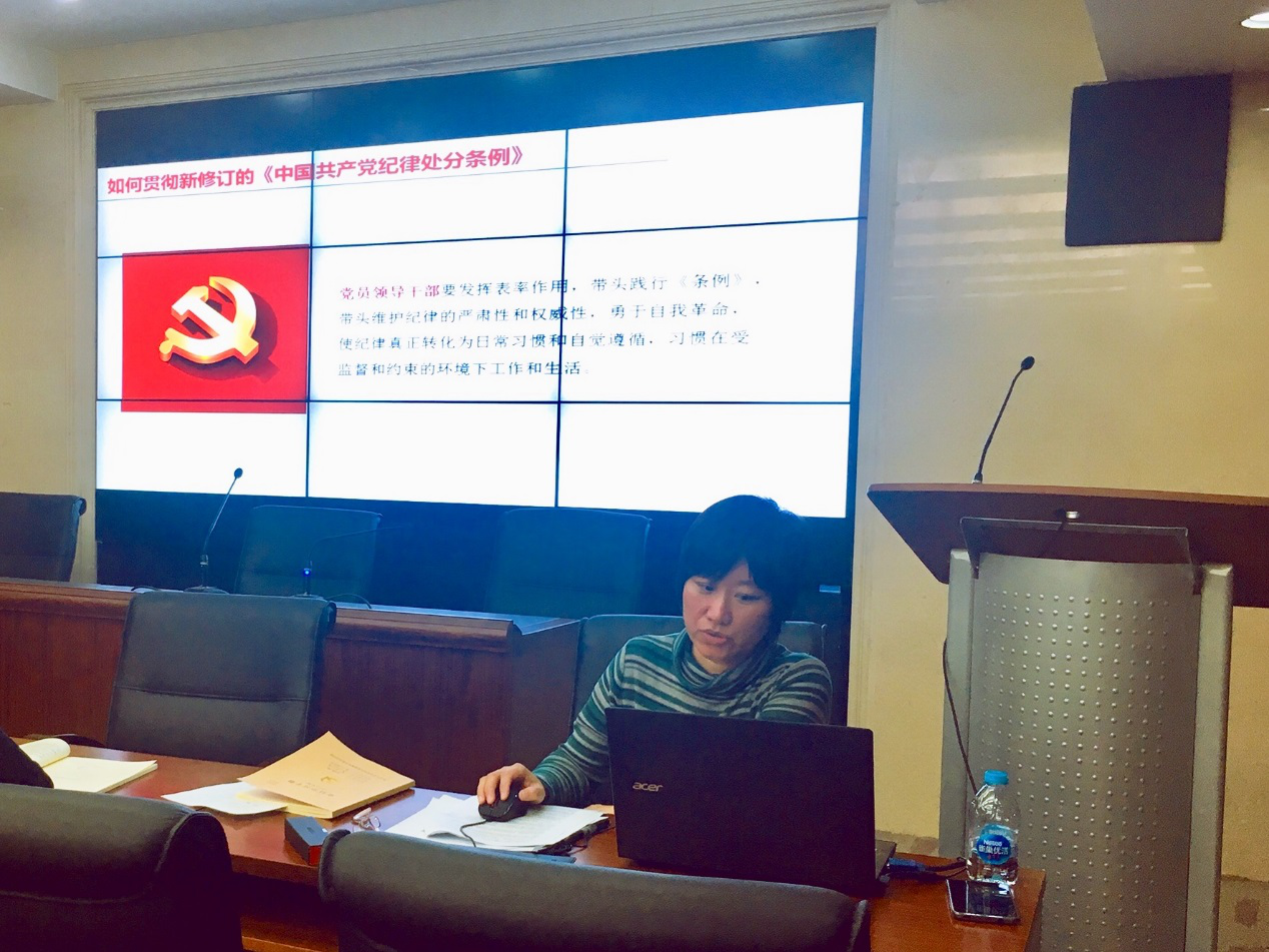 为提高党员学习质量和会议效率,支部于会前下发了习近平总书记《在庆祝改革开放40周年大会上的讲话》《<中国共产党纪律处分条例>修订前后对照表》等学习材料,并在微信群里分享了中纪委关于《中国共产党纪律处分条例》的学习宣传视频供各位党员自学。会上晏晓峰同志和徐红梅同志分别就《辩证唯物主义是中国共产党人的世界观和方法论》和《努力造就一支忠诚干净担当的高素质干部队伍》做了自学体会交流。会议当天上午支部纪检委员李琳琳同志坚持拄拐参加中心项目的材料验收工作,下午她为大家讲授党课,她的爱岗敬业精神深深感染了支部每位党员,彰显了共产党人严于律己、顽强拼搏的工作作风。通过此次学习,支部全体党员对新修订的《中国共产党纪律处分条例》有了更深刻地认识和理解,大家纷纷表示,要进一步增强学习贯彻的自觉性和主动性,不断提高政治站位,坚守党的政治纪律和政治规矩,向身边人学习,从身边事出发,推动党建与业务工作融合发展。