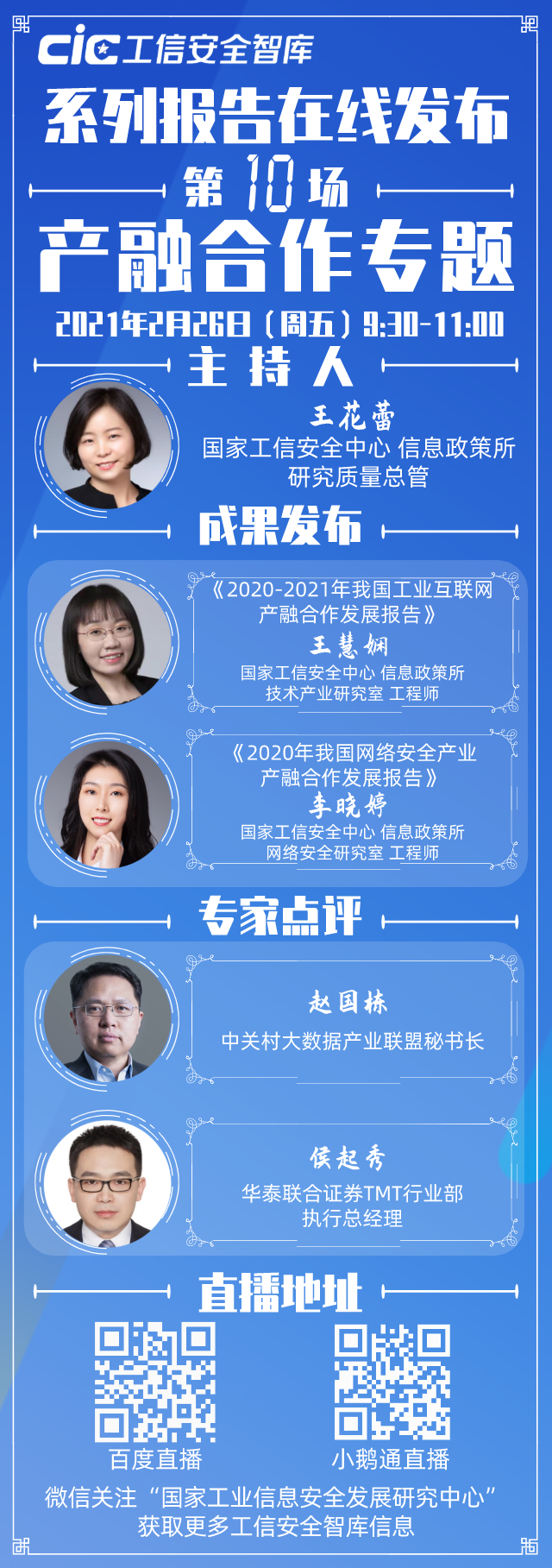 第十场“工信安全智库”系列报告在线发布活动将于2月26日上午9:30准时上线。本次发布活动重点围绕党的十九届五中全会提出的“推动经济体系优化升级加快发展现代产业体系”和《中共中央关于制定国民经济和社会发展第十四个五年规划和二〇三五年远景目标的建议》中的“构建金融有效支持实体经济的体制机制”等要求,以“产融合作”为主题,发布《2020-2021年我国工业互联网产融合作发展报告》和《2020年我国网络安全产业产融合作发展报告》两份“工信安全智库”洞察系列报告。发布活动将由中心信息政策所研究质量总管王花蕾主持。