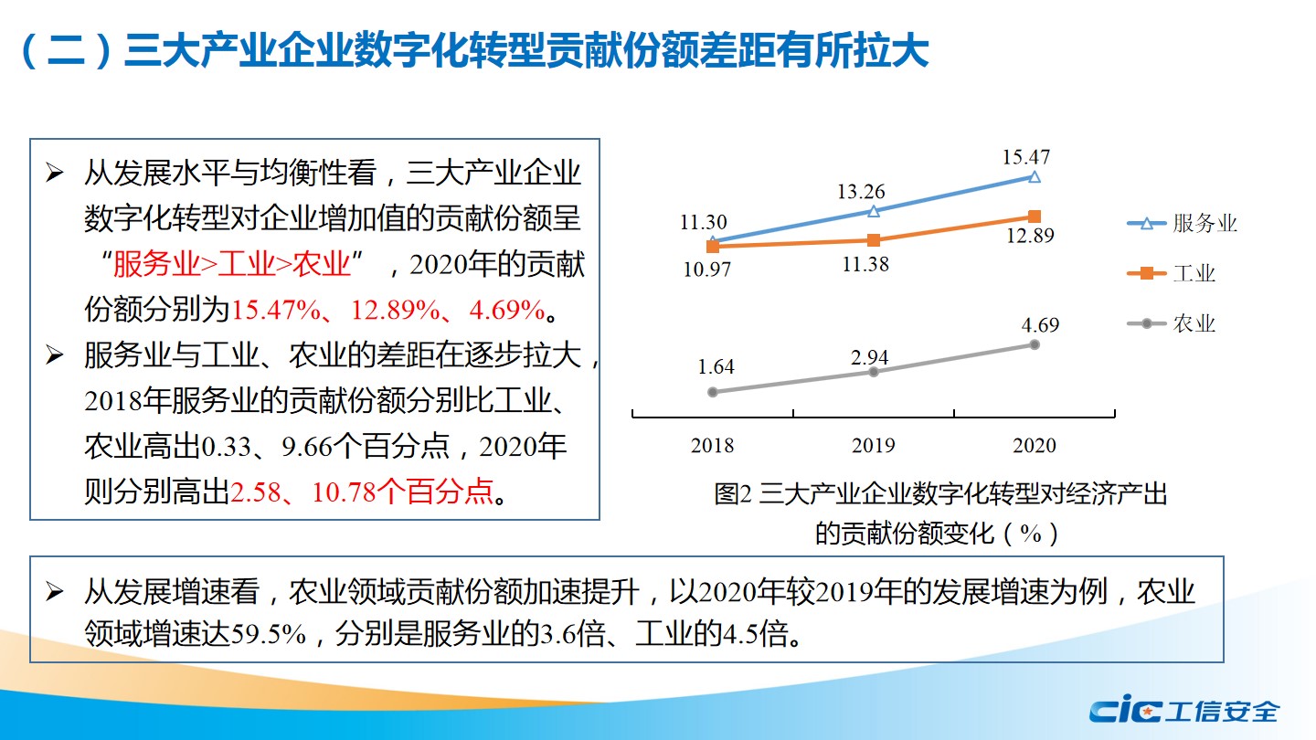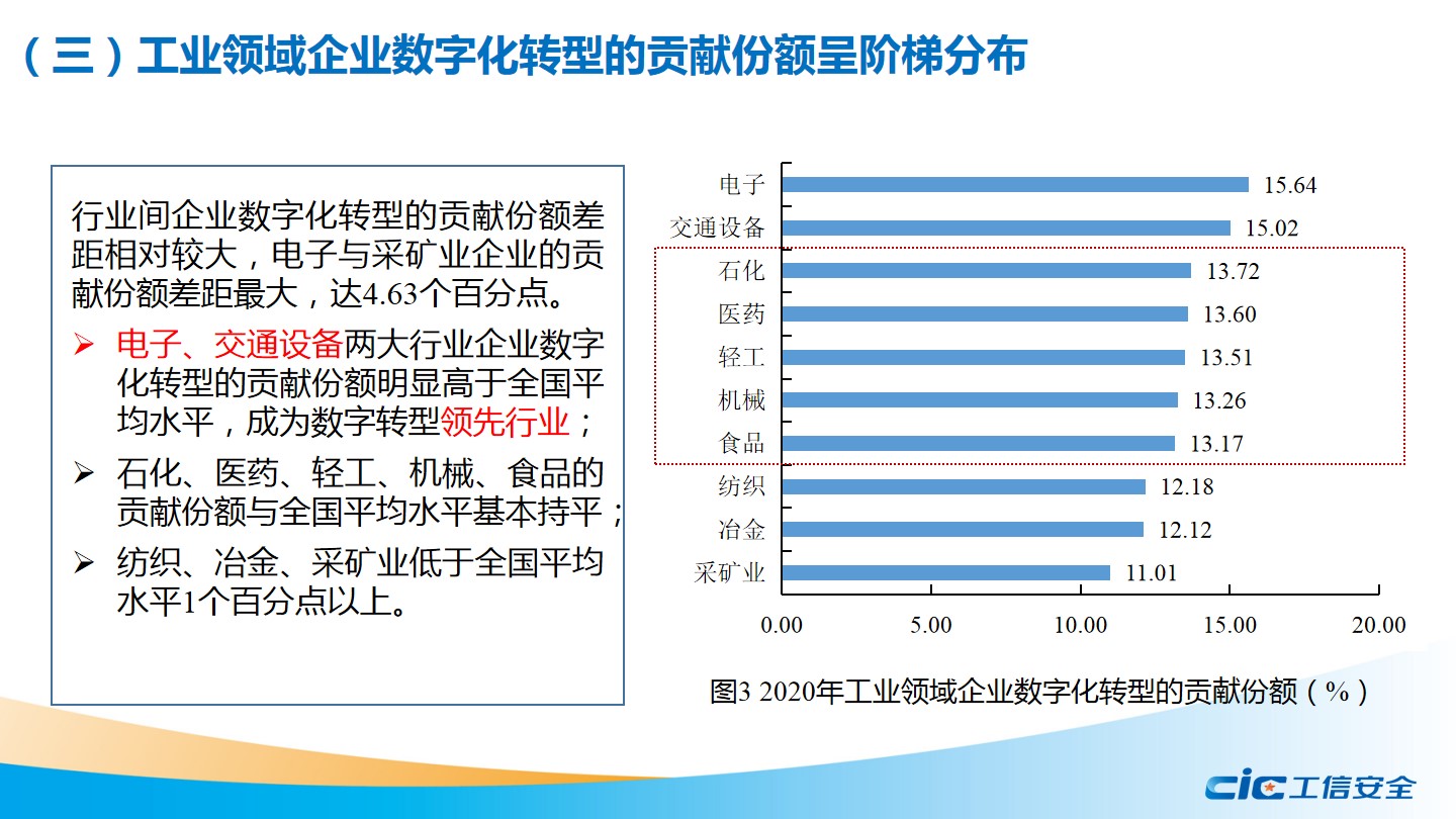 本报告测算了我国企业数字化转型发展水平,分析了领先行业企业数字化转型的实践经验,提出未来发展建议。报告发现,我国企业数字化转型对经济产出的贡献份额逐年增长,2020年我国企业数字化转型对企业增加值的贡献份额为13.31%,较2018年上升了2.23个百分点,预计未来十年内企业数字化转型带来的GDP增量将达到13.88万亿元。三大产业企业数字化转型贡献份额的差距有所拉大,2020年服务业、工业、农业企业的贡献份额分别为15.47%、12.89%、4.69%。工业领域企业数字化转型的贡献份额呈阶梯分布,电子、交通设备两大行业企业数字化转型的贡献份额最高,分别达到15.64%、15.02%,成为数字转型领先行业。对于数字化转型领先行业的企业来说,高层领导和战略规划是第一要务,设备改造和采销线上化是切入点,产品创新与协同是重要牵引力。下一步,应精准推进企业数字化转型,增强数字化转型服务供给,加大中小微企业数字化转型支持力度,推动企业利用数字化转型增强发展韧性。