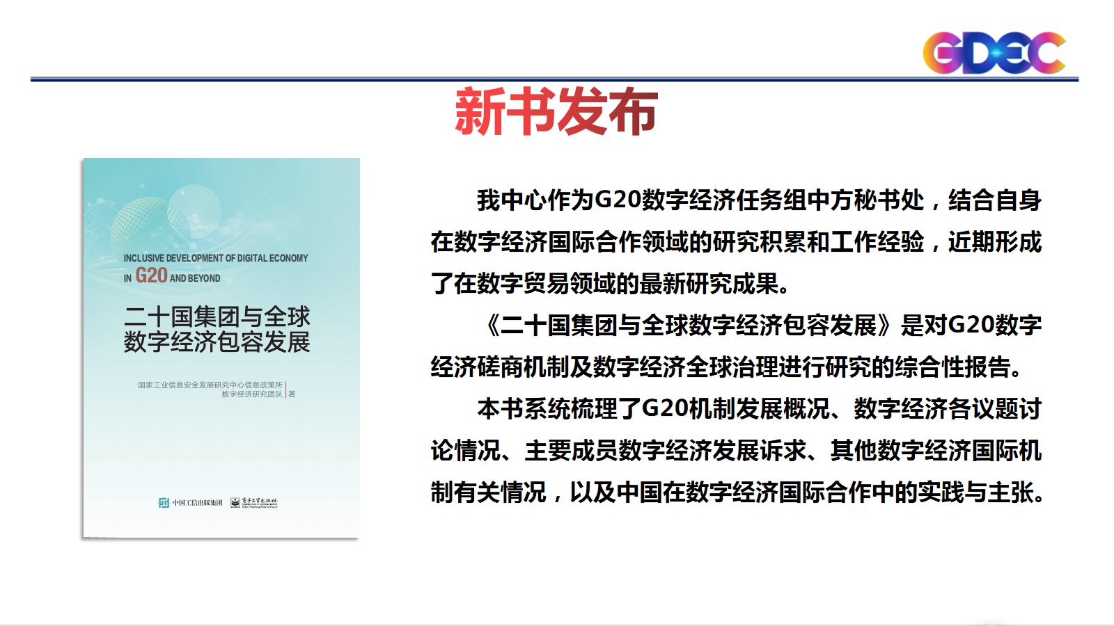 最后,蒋艳在会上正式发布《二十国集团与全球数字经济包容发展》。本书是对G20数字经济磋商机制及数字经济全球治理进行研究的综合性报告,系统梳理了G20机制发展概况、数字经济各议题讨论情况、主要成员数字经济发展诉求、其他数字经济国际机制有关情况,以及中国在数字经济国际合作中的实践与主张,可供数字经济领域的主管领导、专家学者、研究人员参考借鉴。下一步,中心作为G20数字经济任务组中方秘书处,将充分结合自身在数字经济国际合作领域的研究积累和工作经验,继续为2021年G20数字经济系列会议贡献力量。