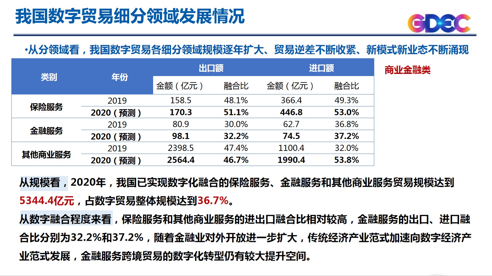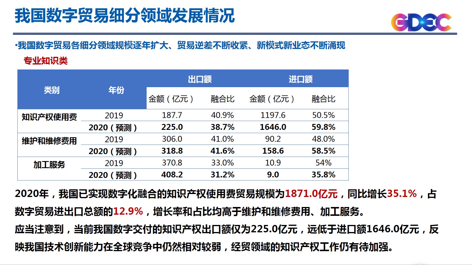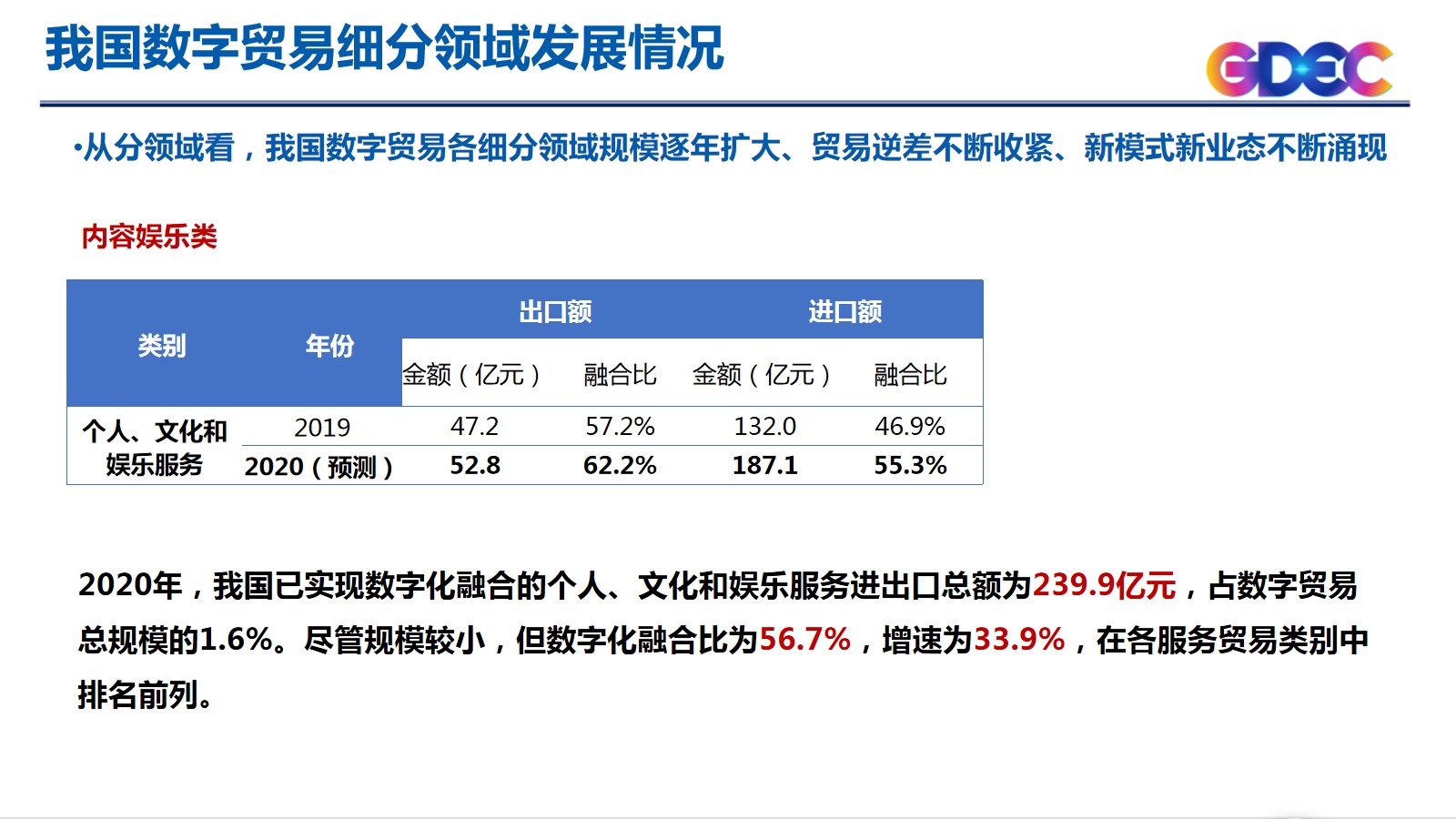关于我国数字贸易发展情况,我中心基于融合比法,利用商务部发布的我国服务贸易统计数据和两化融合平台上的企业数据,预测我国2020年数字贸易规模。从整体上看,我国数字贸易规模与占整体服务贸易比重均稳定增长。预计2020年,我国数字贸易规模达到1.46万亿元,同比增长20.5%,增速高于服务贸易整体增速15.6个百分点,数字贸易占整体服务贸易的比重从2019年的22.3%增长至2020年的25.6%,数字贸易对服务贸易的贡献率持续攀升,反映我国贸易焦点正在加快沿着“货物贸易-服务贸易-数字贸易”路径演进。从分领域看,我国数字贸易各细分领域规模逐年扩大、贸易逆差不断收紧、新模式新业态不断涌现。信息通信类进出口规模约为6201.8亿元,在数字贸易整体规模中占比最高,为42.6%,进出口数字融合比达到100%。内容娱乐类进出口总额为239.9亿元,占数字贸易总规模的1.6%。数字化融合比和增速在各服务贸易类别中排名前列。商业金融类贸易规模达到5344.4亿元,占数字贸易整体规模达到36.7%。专业知识类:我国已实现数字化融合的知识产权使用费贸易规模为1871.0亿元,同比增长35.1%,占数字贸易进出口总额的12.9%,增长率和占比均高于维护和维修费用、加工服务。