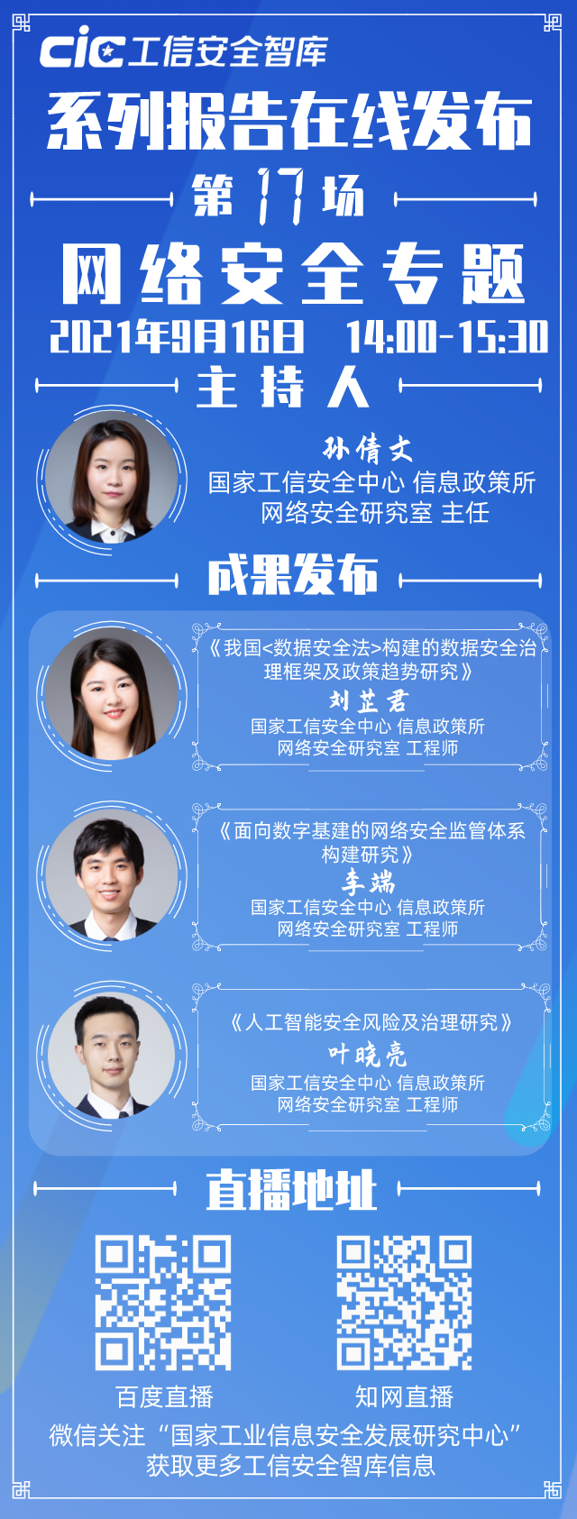 第十七场“工信安全智库”系列报告在线发布活动将于明日(9月16日)下午2:00准时上线。本次发布活动以“网络安全”为主题,发布《我国<数据安全法>构建的数据安全治理框架及政策趋势研究》《面向数字基建的网络安全监管体系构建研究》《人工智能安全风险及治理研究》三份报告。发布活动将由中心信息政策所网络安全研究室主任孙倩文主持。