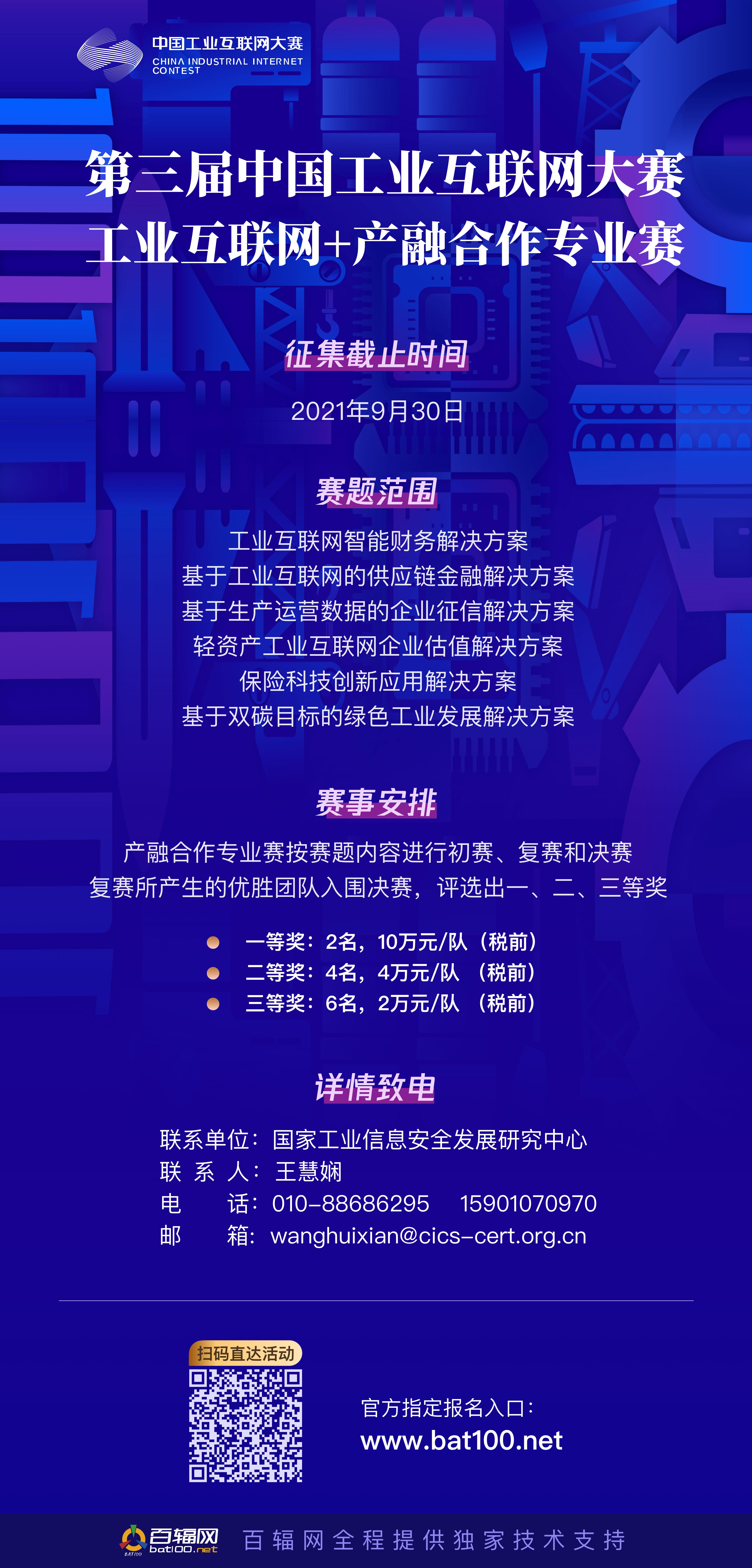 产融合作专业赛重点征集工业互联网智能财务、基于工业互联网的供应链金融、基于生产运营数据的企业征信、轻资产工业互联网企业估值、保险科技创新应用、基于双碳目标的绿色工业发展六大赛题解决方案。赛事设置一、二、三等奖。报名时间截止至2021年9月30日。