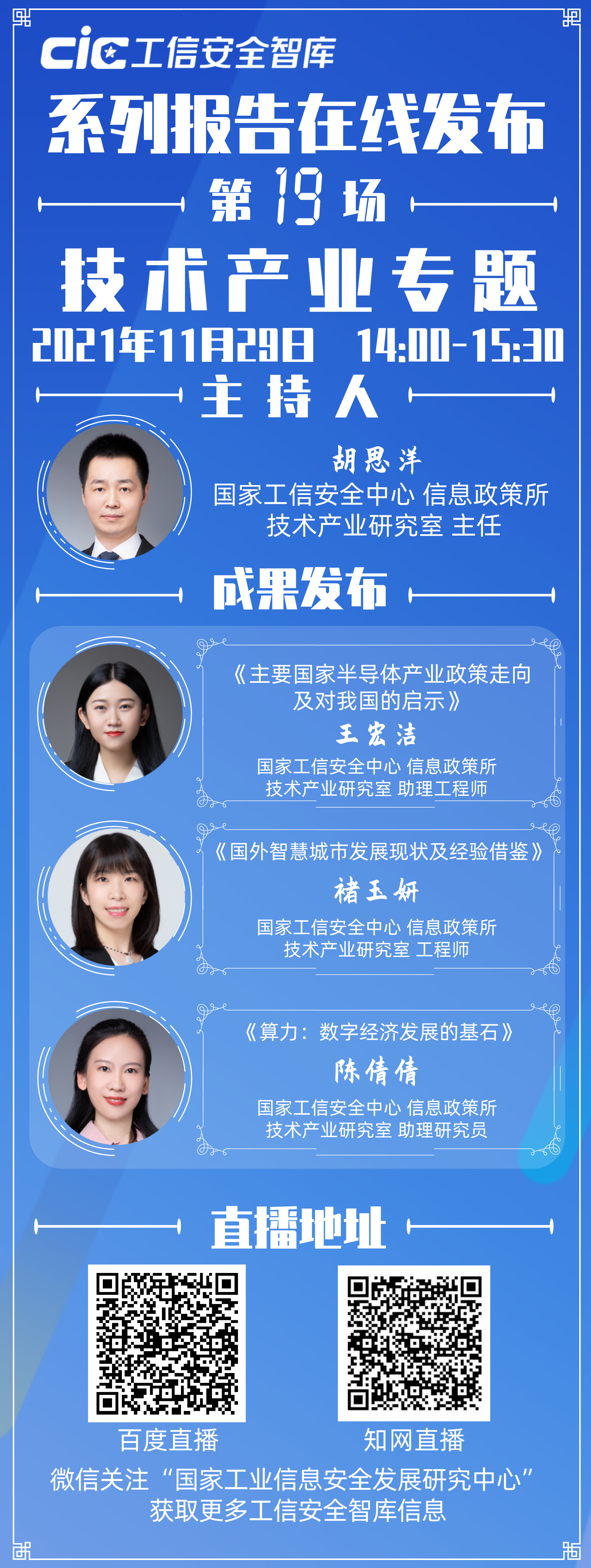 第十九场“工信安全智库”系列报告在线发布活动将于下周一(11月29日)下午2:00准时上线。本次发布活动以“技术产业”为主题,发布《主要国家半导体产业政策走向及对我国的启示》《国外智慧城市发展现状及经验借鉴》《算力:数字经济发展的基石》三份报告。发布活动将由中心信息政策所技术产业研究室主任胡思洋主持。