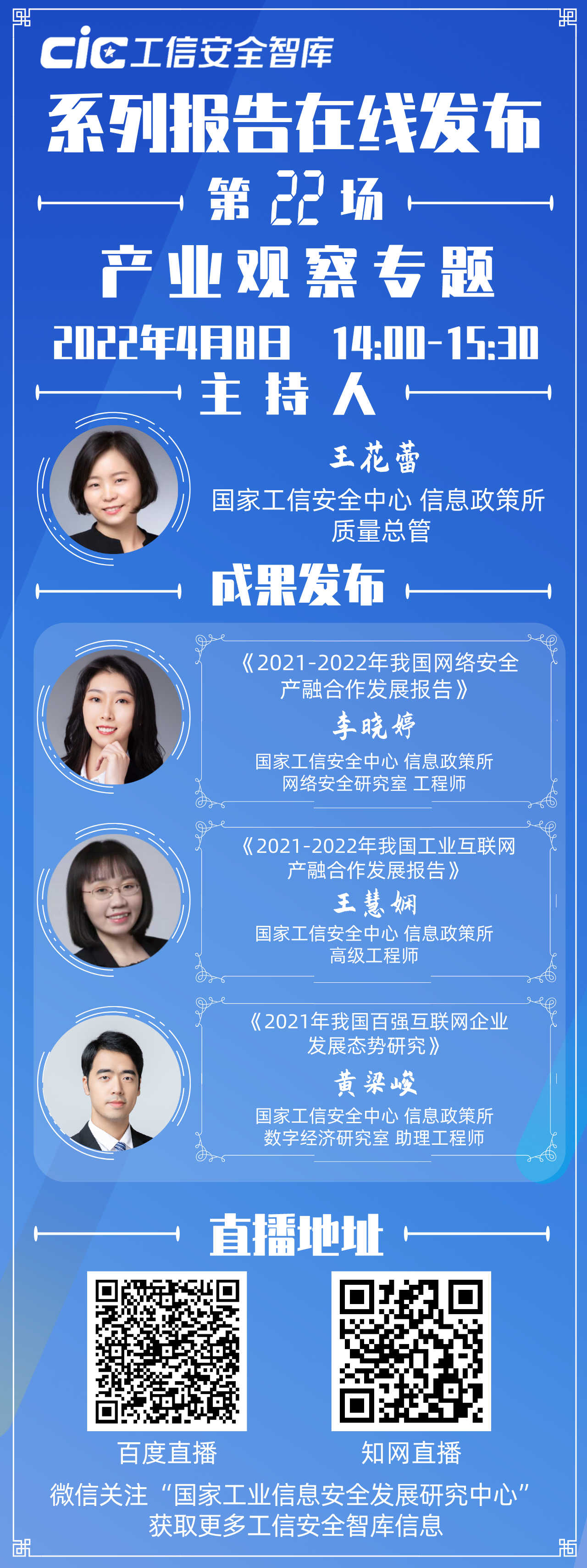 第二十二场“工信安全智库”系列报告在线发布活动将于本周五(4月8日)下午2:00准时上线。本次发布活动以“产业观察”为主题,发布《2021-2022年我国网络安全产融合作发展报告》《2021-2022年我国工业互联网产融合作发展报告》和《2021年我国百强互联网企业发展态势研究》三份报告。发布活动将由中心信息政策所质量总管王花蕾主持。