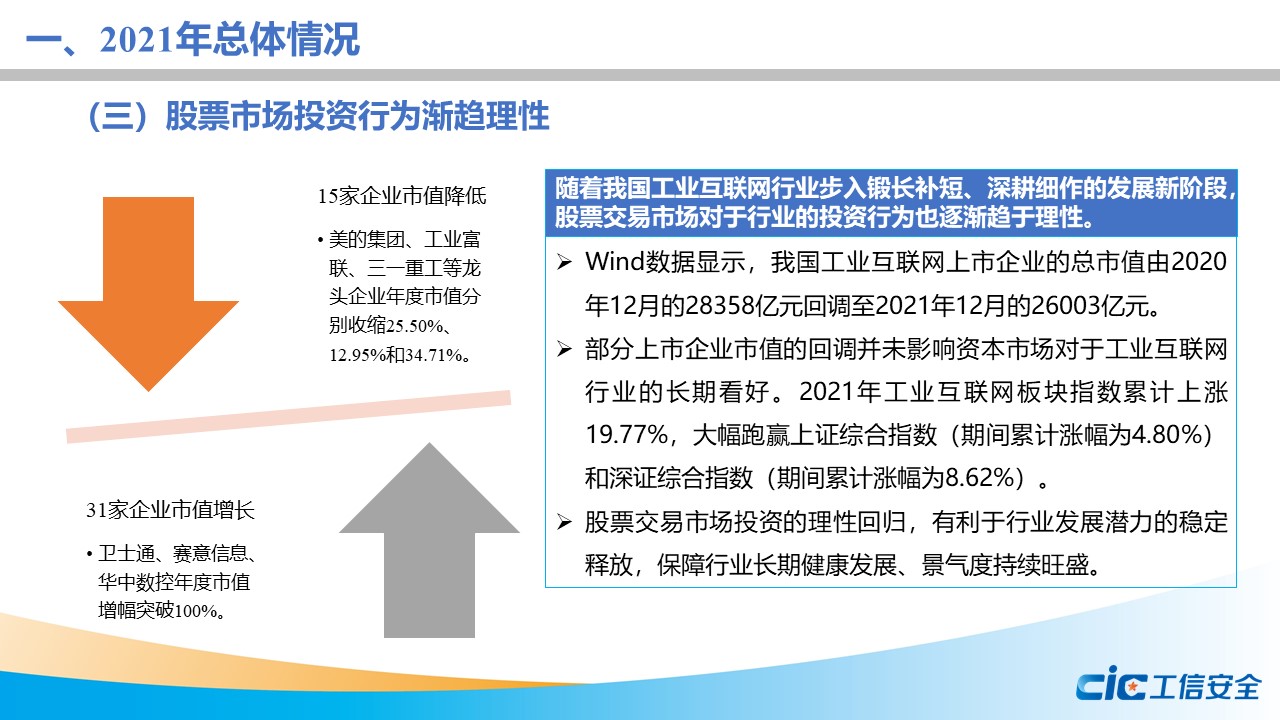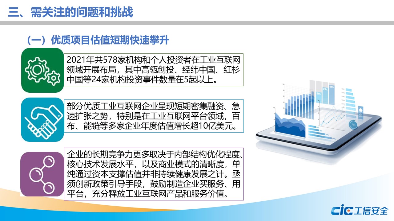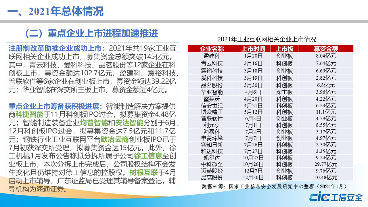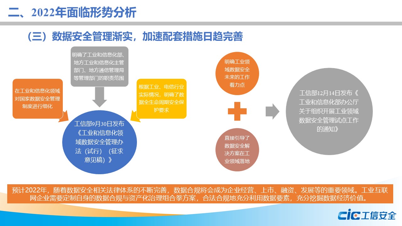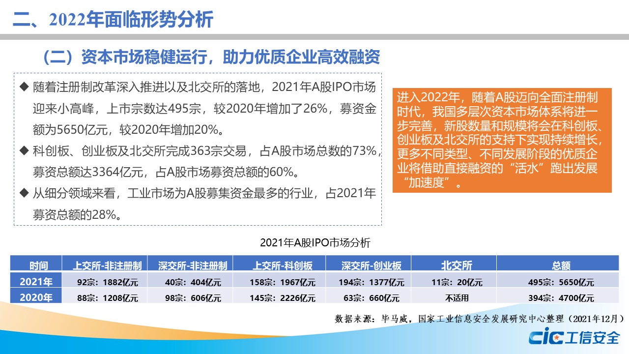报告认为,当前我国工业互联网发展面临政策环境持续优化、资本市场稳健运行、数据安全管理渐实等有利条件。2022年,随着A股迈向全面注册制时代,新股数量和规模将在科创板、创业板及北交所的支持下实现持续增长,更多不同类型、不同发展阶段的优质工业互联网企业有望借助直接融资的“活水”跑出发展“加速度”。同时,随着数据安全相关法律体系的不断完善,数据合规将会成为相关企业经营、上市、融资、发展等的重要课题。