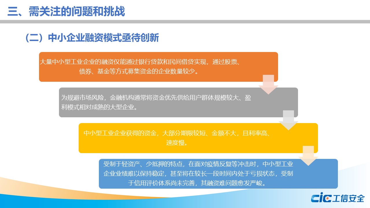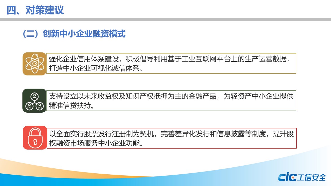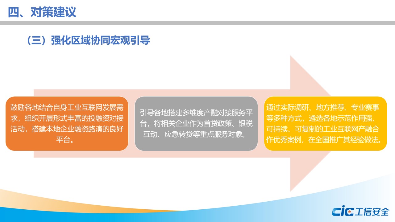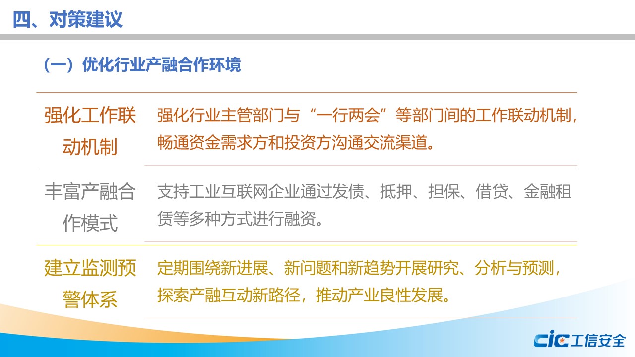 报告强调,当前我国工业互联网产融合作也面临着优质项目估值短期快速攀升、中小企业融资模式亟待创新、区域产融合作发展差距明显等问题应引起重视。未来应加快建立工业互联网产融合作监测预警体系,积极探索产融互动、产融双驱新路径。同时,强化企业信用体系建设,积极倡导利用基于工业互联网平台上的生产运营数据,打造中小企业可视化诚信体系。此外,还应通过组织开展投融资对接活动、产融合作专业赛事等方式,强化区域协同宏观引导,打造产业与金融良性互动、共生共荣的发展局面。
