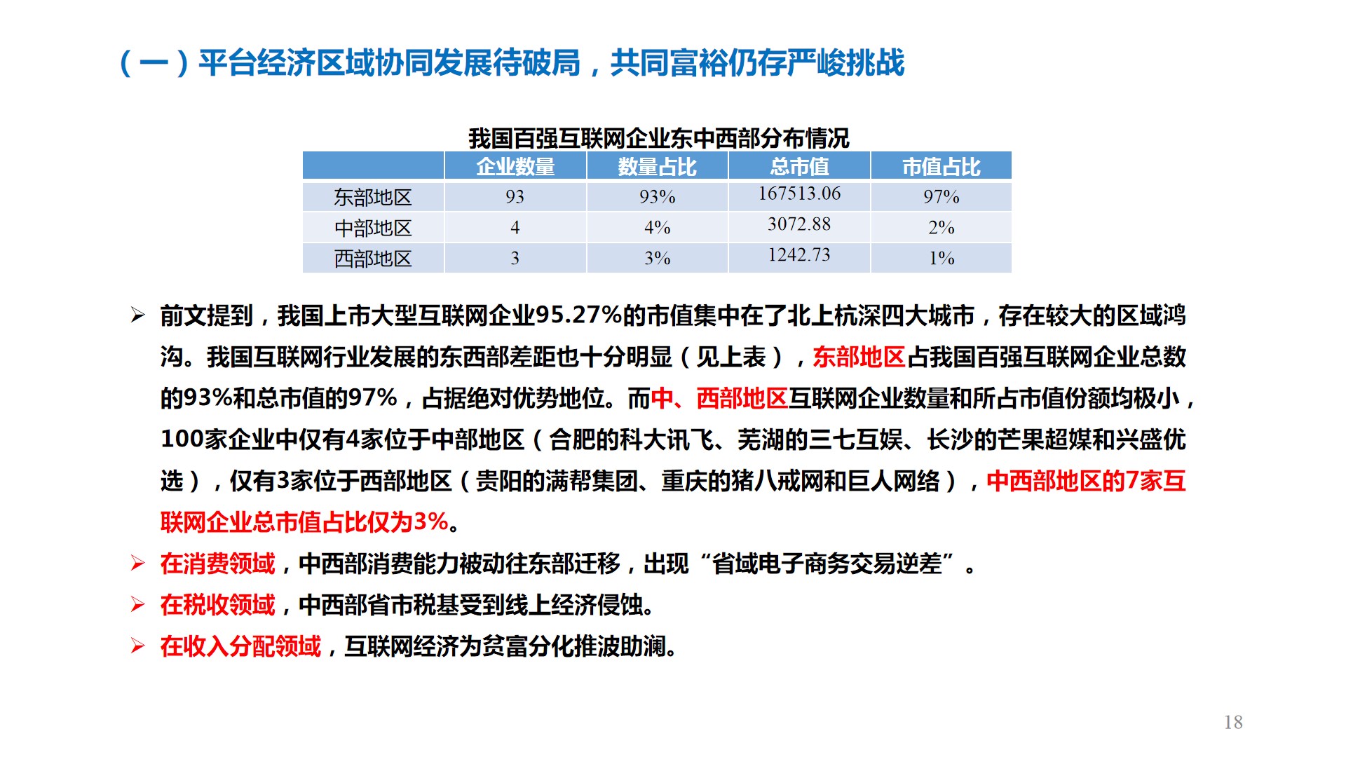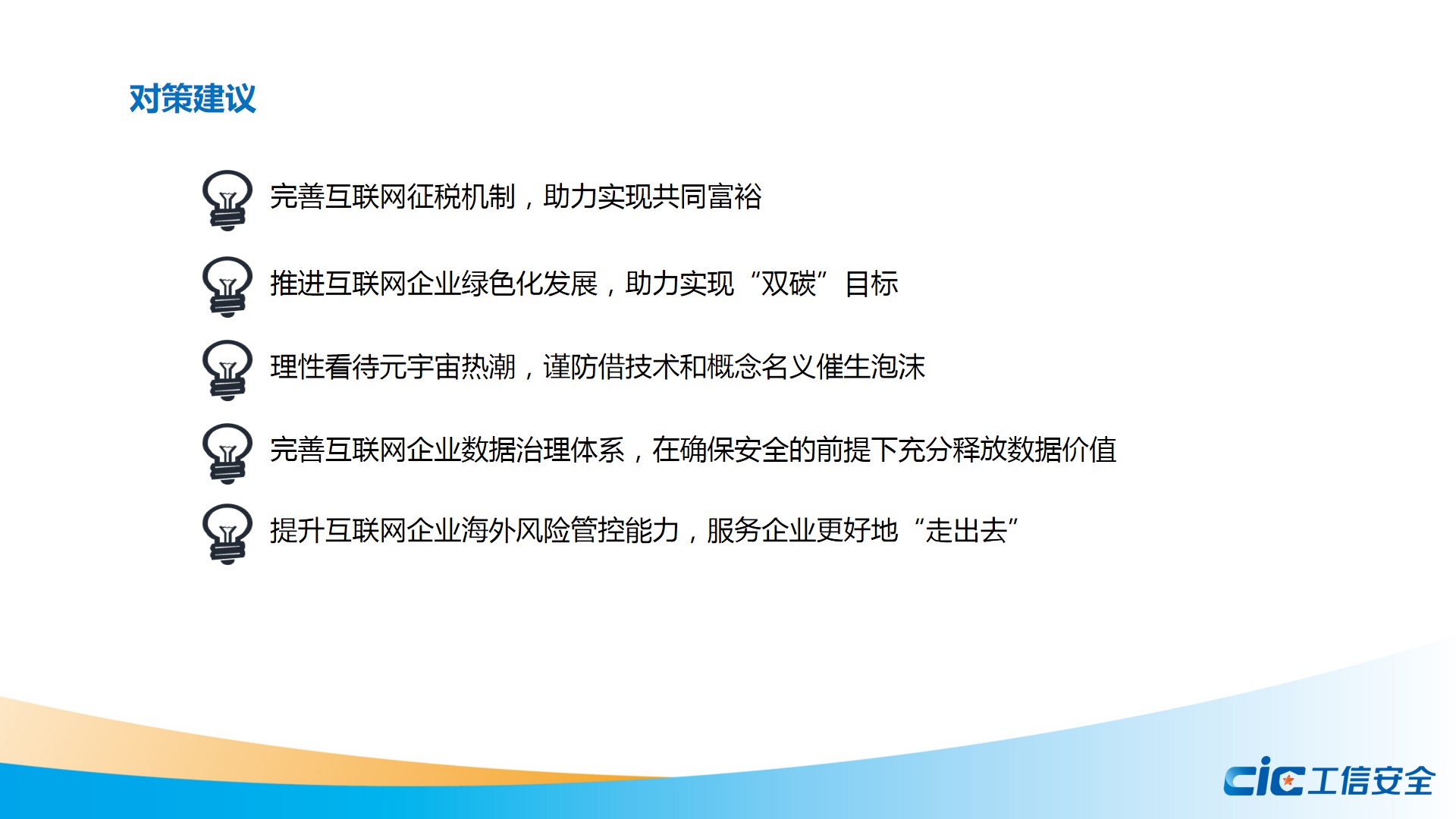针对这些问题,报告建议完善对互联网企业的征税机制,解决区域间税收利益分配不公平不合理问题,强化对线上商户和网红主播的税收稽查,稳妥推进共同富裕。引导企业设立“双碳”目标及完成的时间线路图,以数字化赋能绿色化发展。理性看待元宇宙热潮,谨防借技术和概念名义催生泡沫,让元宇宙赛道回归到夯实数字技术研究的基本面上来。探索建立公共管理领域的企业数据专员制度,完善数据跨境流动管辖与信任体系,以坚持共享共用、激励价值创造为根本遵循,充分释放平台数据社会价值。鼓励引导数字企业“抱团出海”,探索差异化发展路径,提升互联网企业海外风险管控能力,服务企业更好地“走出去”。