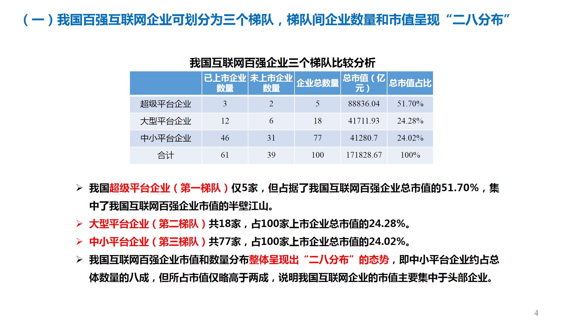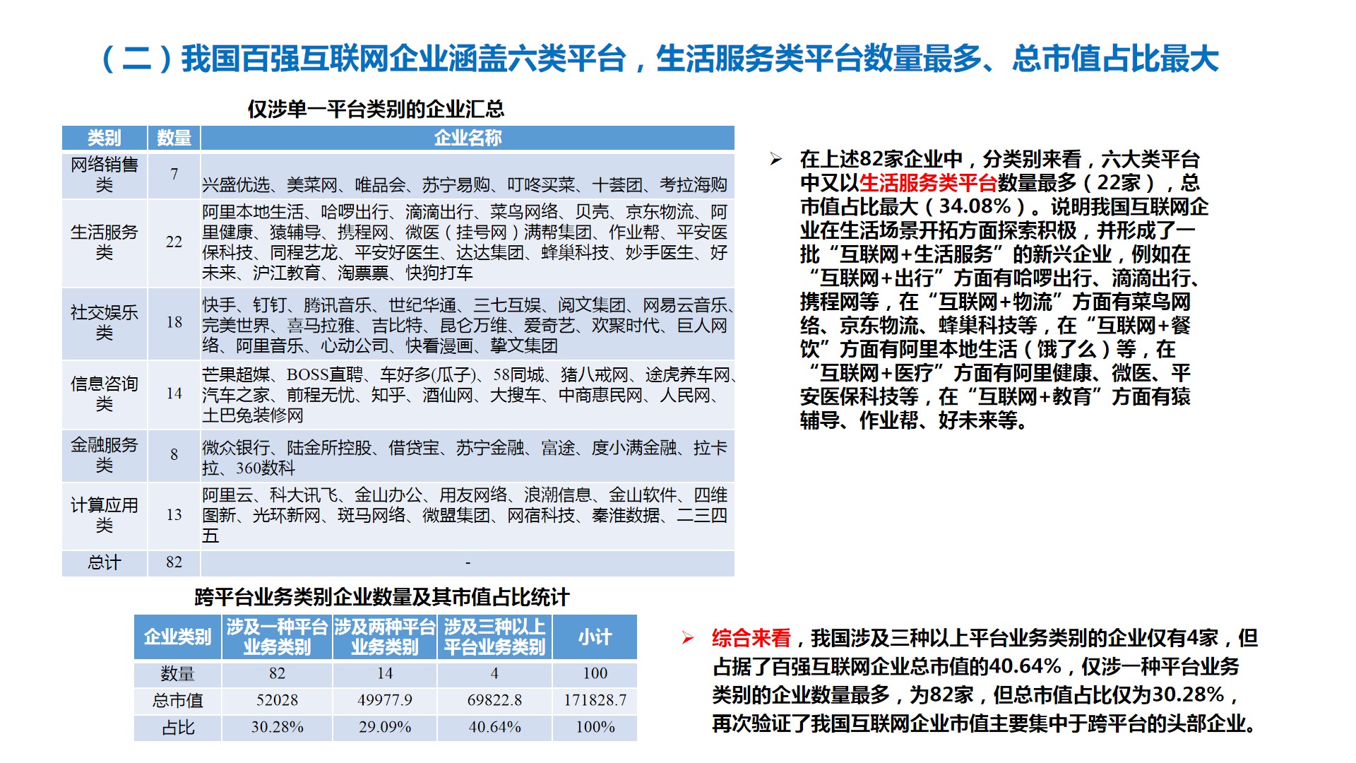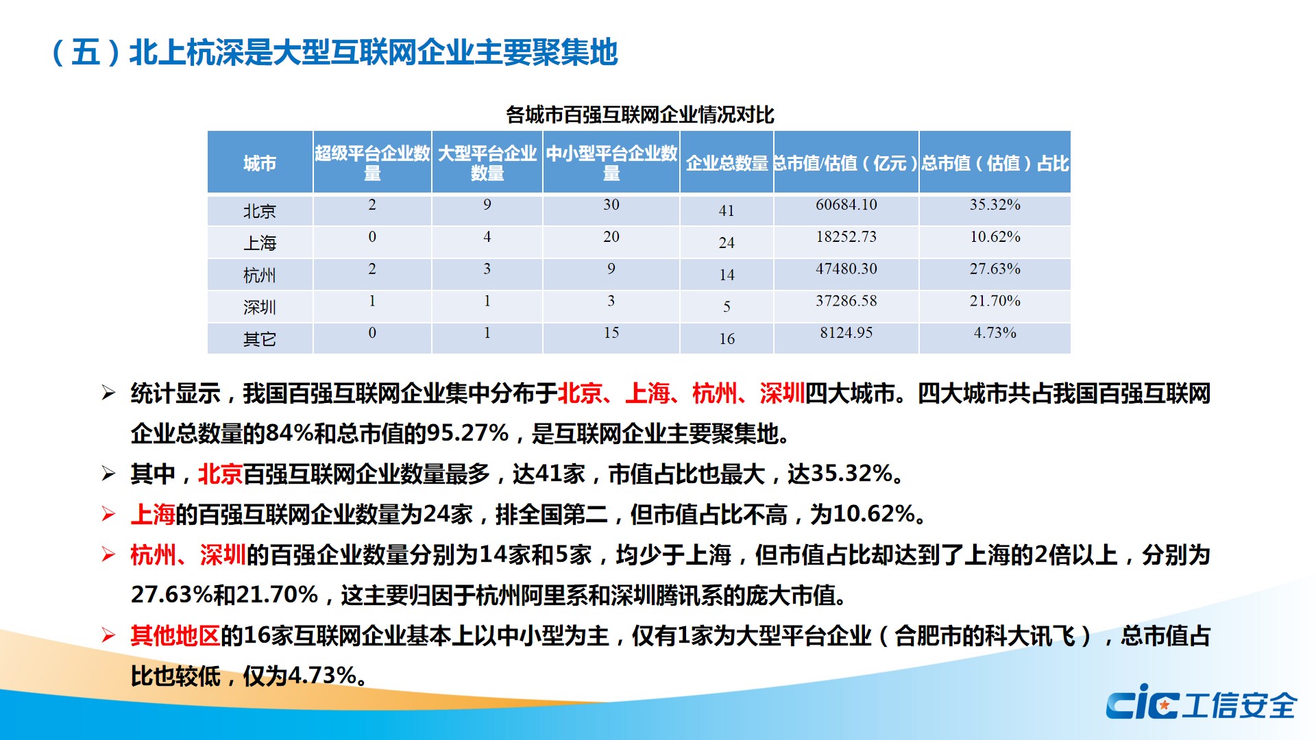 报告指出,我国百强互联网企业分为超级平台企业、大型平台企业、中小平台企业三个梯队,第一梯队的五家超级平台企业占到百强企业总市值一半以上。这些企业分属网络销售、生活服务、社交娱乐、信息咨询、金融服务、计算应用等六大类平台,其中生活服务类平台的数量和市值占比最高。2021年,受平台反垄断、教育“双减”、中概股退市威胁等影响,互联网企业市值呈现普跌态势。在地域分布方面,北京、上海、杭州、深圳是我国大型互联网企业的主要聚集地,占据了我国百强互联网企业总数量的84%和总市值的95.27%。