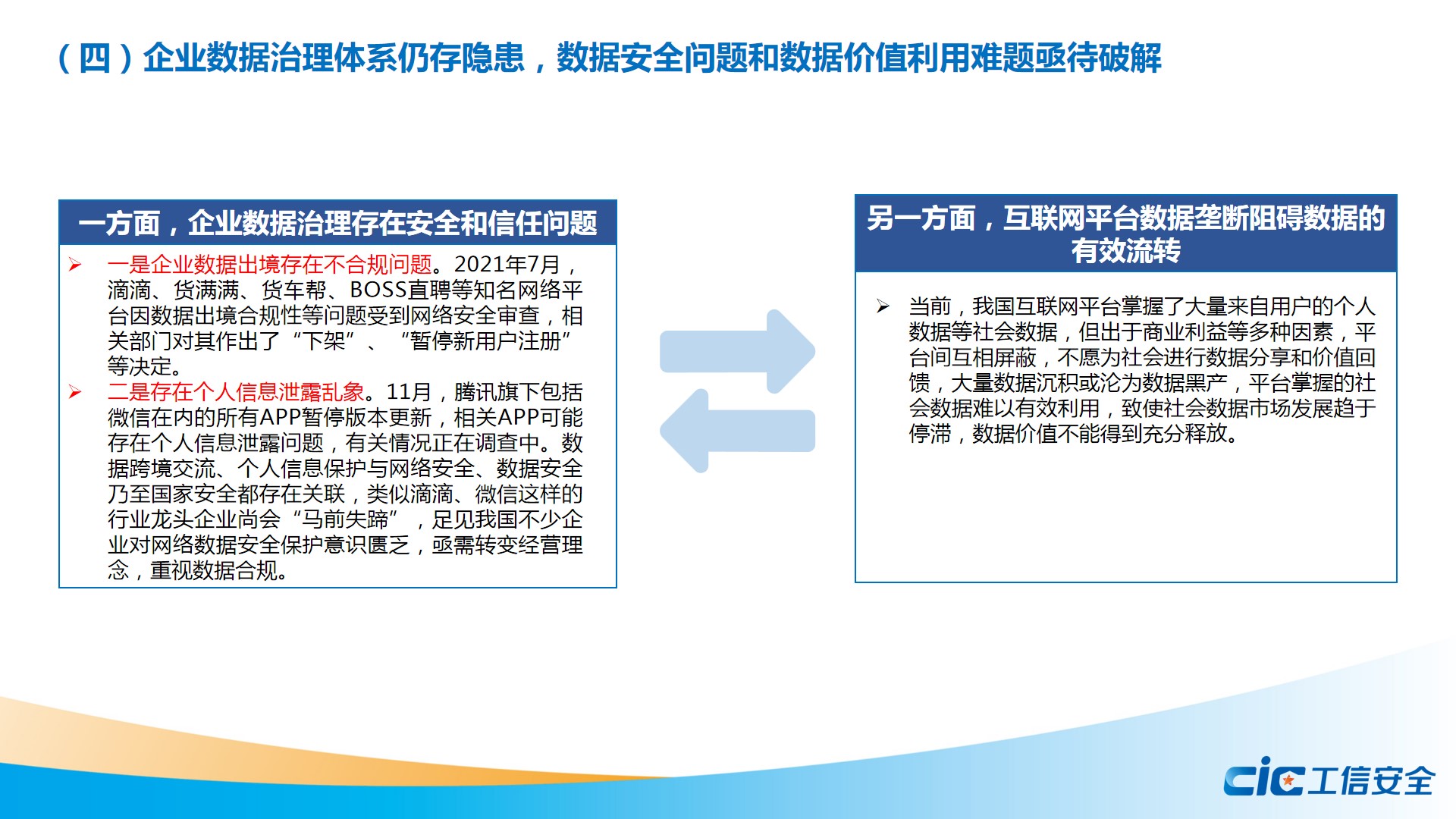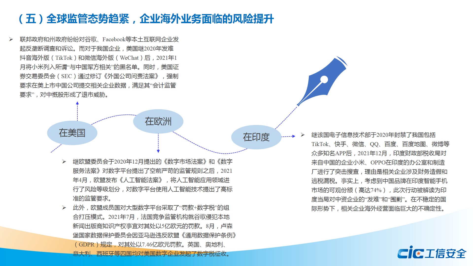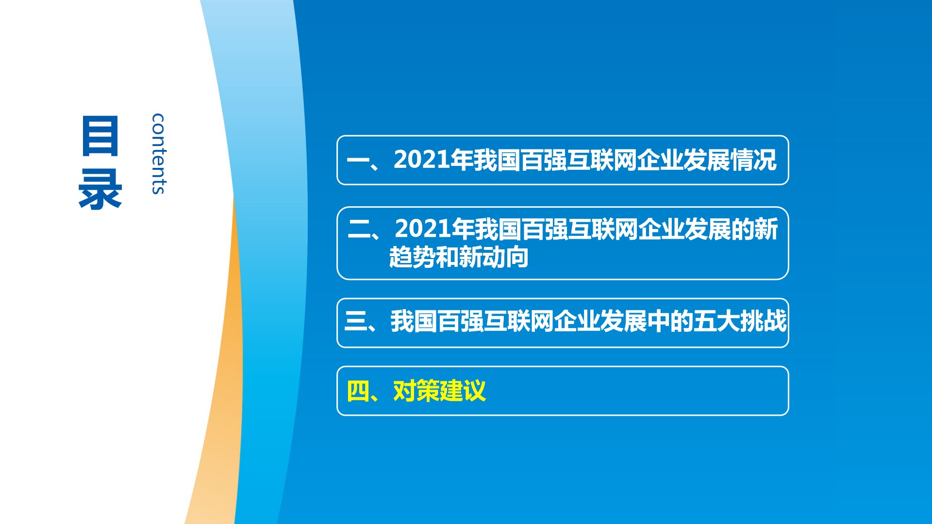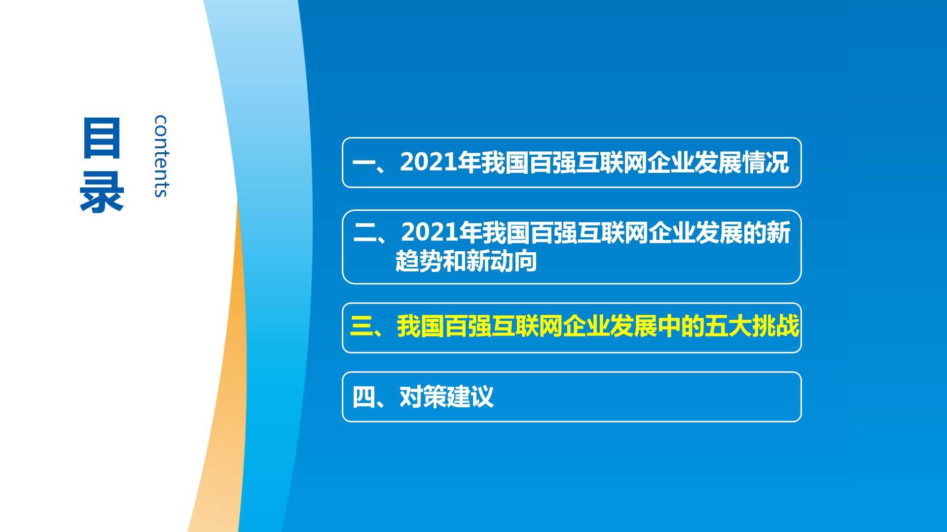 报告认为,2021年,我国百强互联网企业在不断发展的同时,也面临一些问题和挑战。一是互联网企业区域发展不均衡,对共同富裕形成了阻碍。二是互联网企业绿色化进程较国际仍有较大差距。三是元宇宙“虚火过旺”引发投资炒作、行业诈骗等多重问题。四是企业数据治理体系仍存隐患,数据安全问题和数据价值利用难题亟待破解。五是美国、欧盟、印度等全球多个经济体监管态势趋紧,致使企业海外业务风险增大。