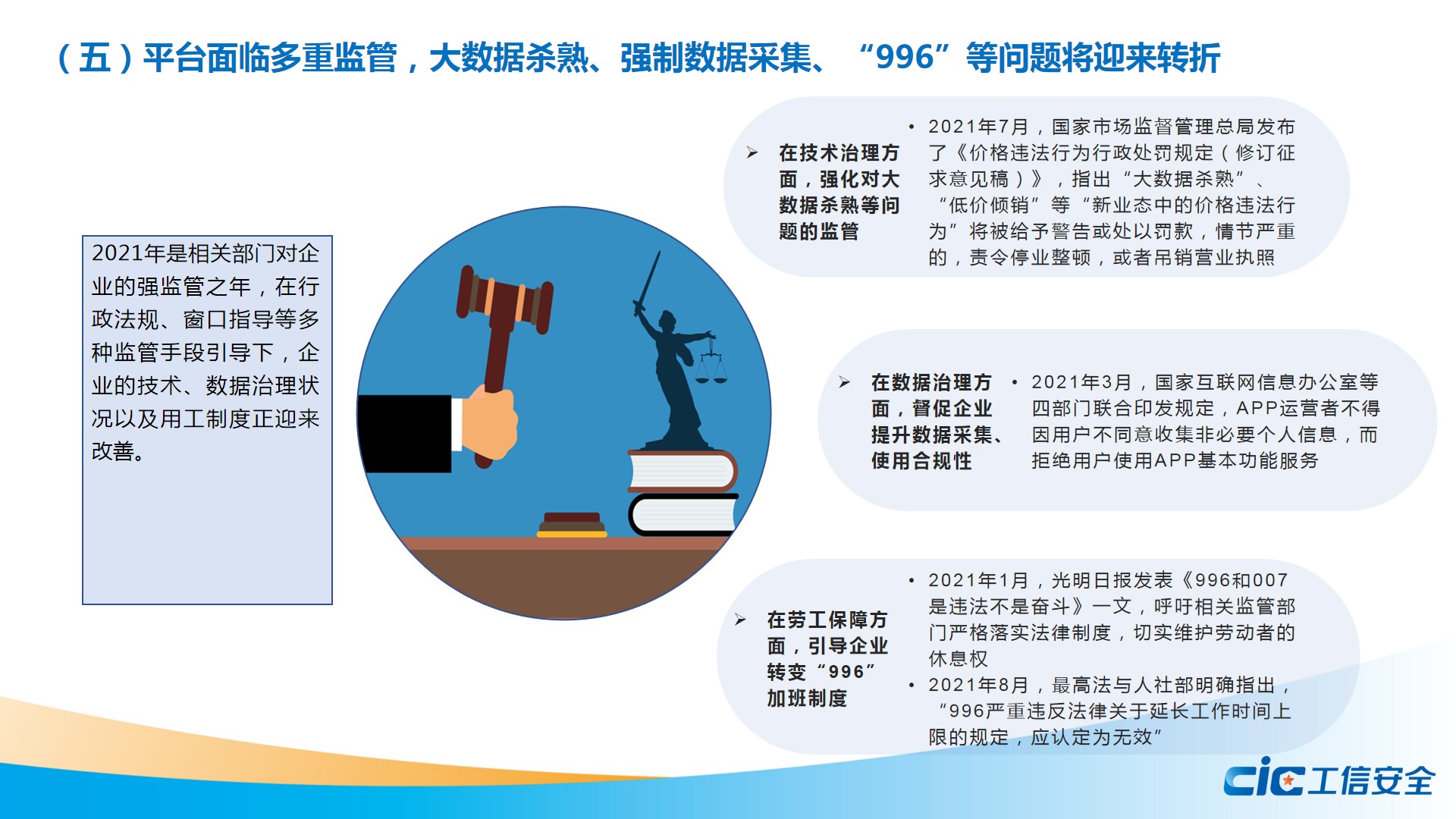 报告发现,从互联网企业的新趋势和新动向来看,2021年部分企业开始把“双碳”目标列入企业战略,稳步推进企业绿色化进程;多家企业入场元宇宙,从技术、内容和组织架构入手,探索构建全真互联网;头部互联网企业积极布局无人驾驶、车联网等应用场景,助力科幻场景转变为现实;同时,在反垄断的政策背景下,互联网企业将无法再依靠“圈地征税”和“唯流量论”获取超额利润;在平台强监管政策驱动下,大数据杀熟、强制数据采集、“996”等问题的解决也将迎来转折。