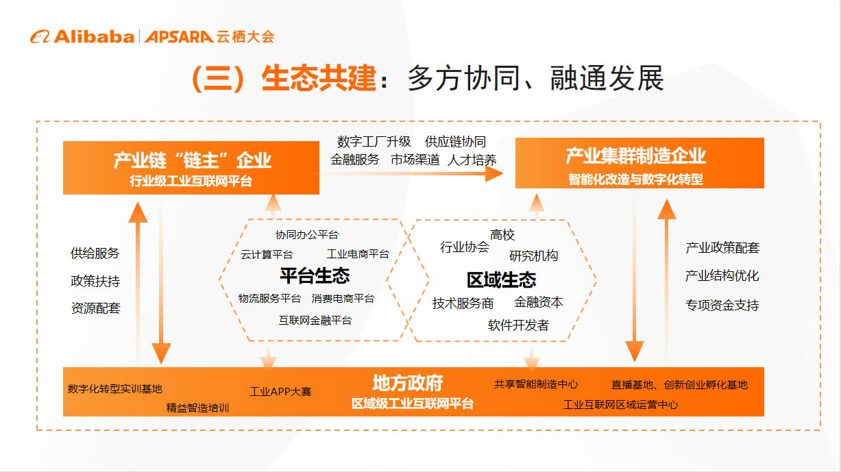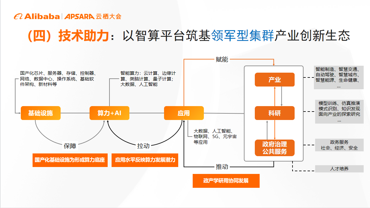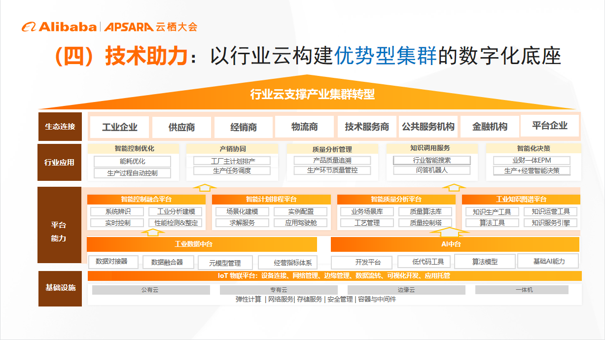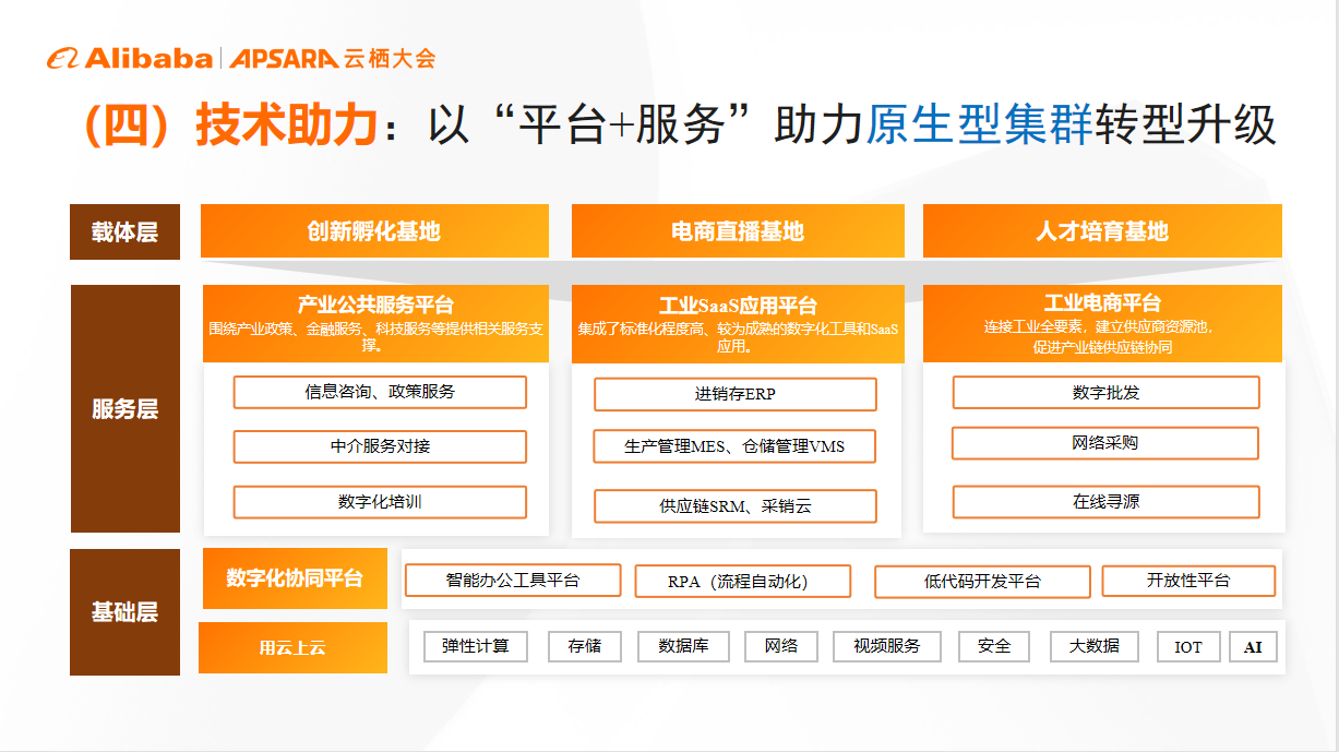报告提出,对于原生型产业集群,重点构建以公有云为基础的一站式数字化平台应用与在线服务,以“平台+服务”模式降低企业数字化投入成本,拓展企业市场渠道,助力集群转型。对于优势型产业集群,重点构建区域行业云的数字化底座,以及在其之上的产业互联环境,提供一系列行业特定能力的平台和应用,为区域的特色行业服务。对于领军型产业集群,需加快以人工智能等智算基础设施为支撑,为集群内的科研服务和企业创新提供强大的智能计算服务,实现技术和产品创新跃迁,构建智慧产业生态。