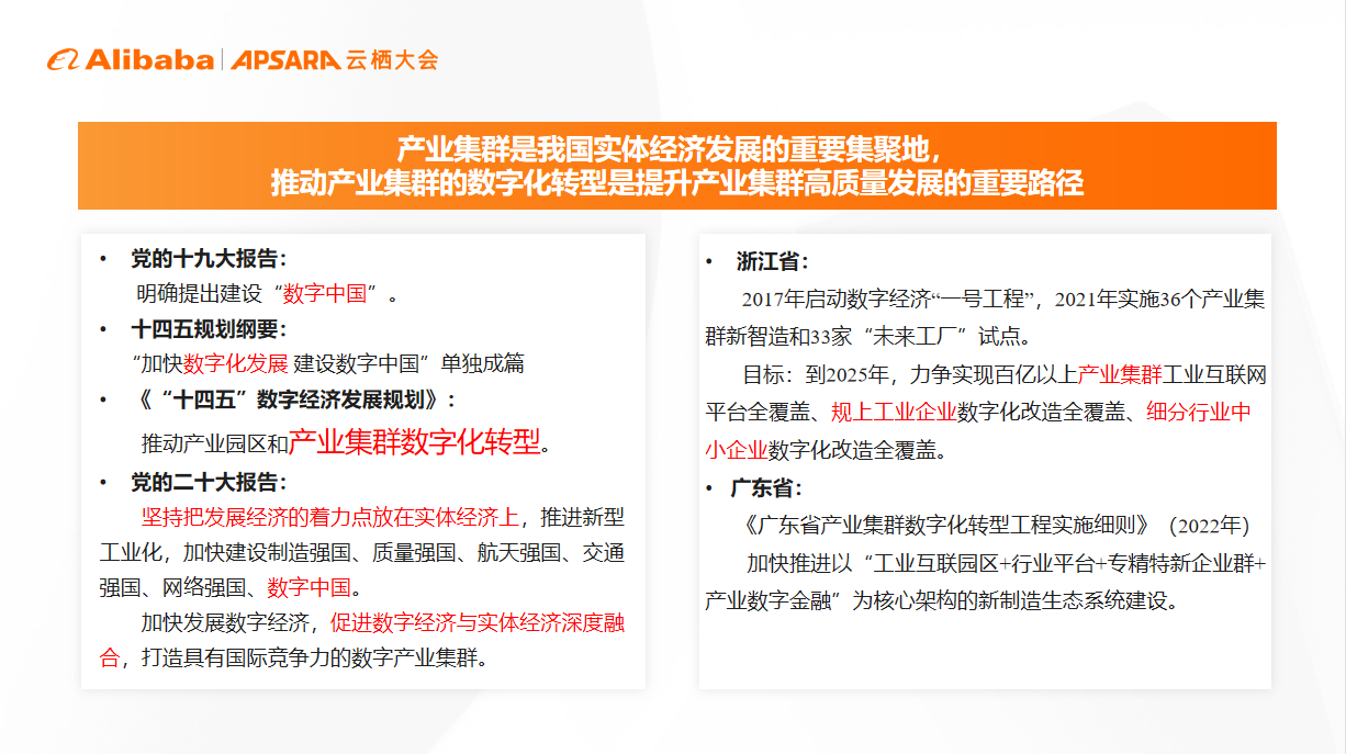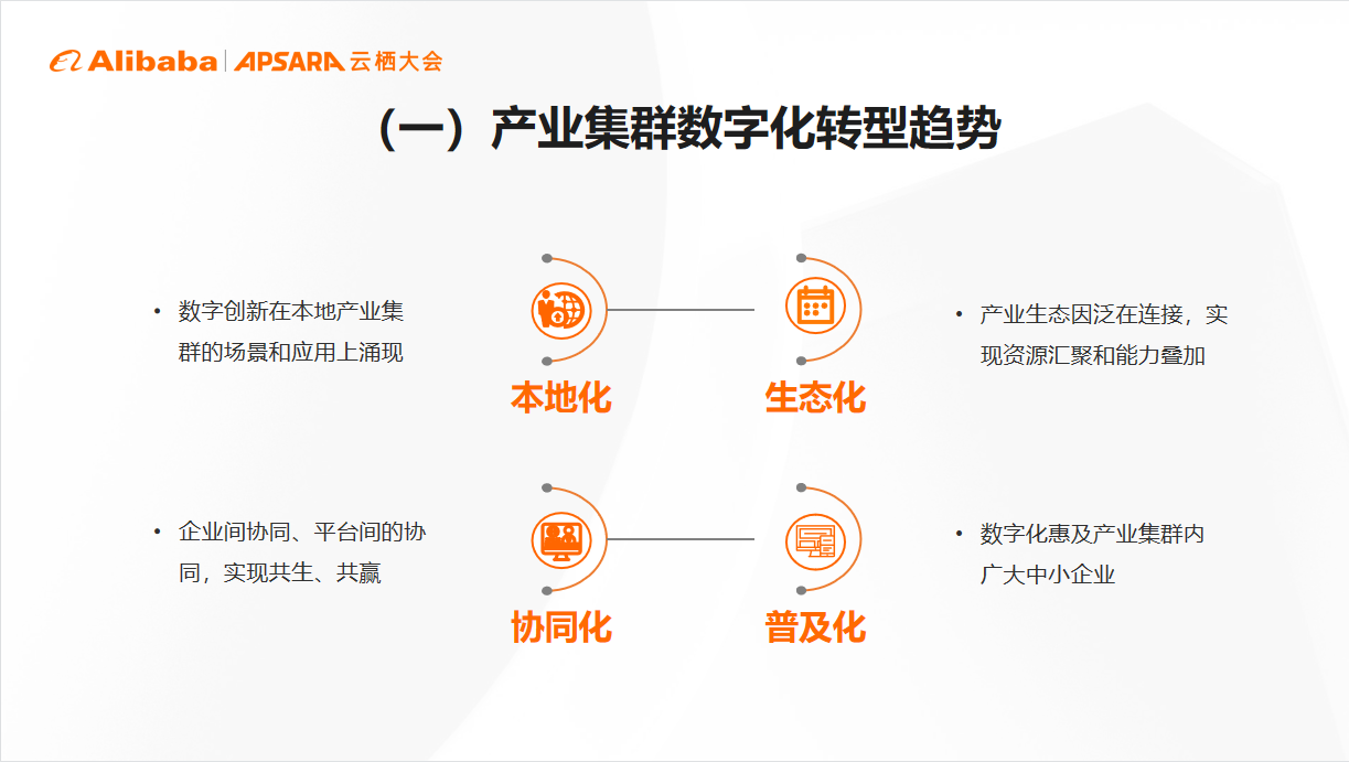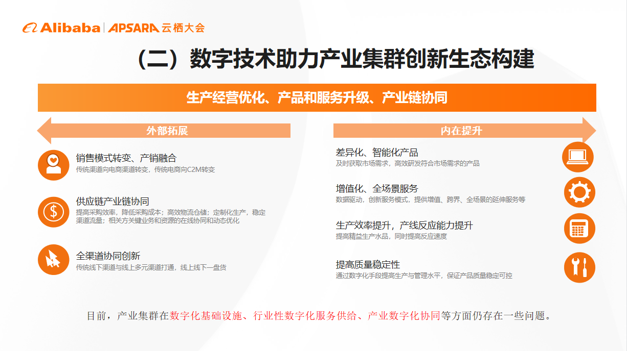 11月4日,2022年云栖大会“数字经济创新发展峰会”在杭州举办。峰会上,国家工业信息发展研究中心(以下简称中心)总工程师黄鹏出席产业集群数字化转型报告发布仪式,中心信息政策所副所长冯媛代表编写组发布《产业集群数字化:构建协同发展的新生态》报告(以下简称报告),报告由中心和阿里云研究院共同完成。