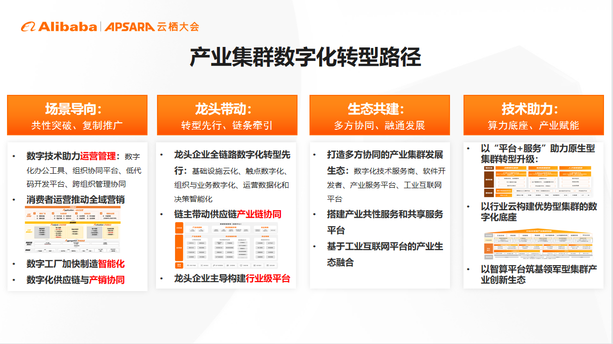 报告认为,虽然不同阶段不同类型的产业集群数字化转型诉求不同,在不同发展时期也有不同的侧重,但其转型路径总体上可归结为四类:一是以场景为导向,推动共性突破、复制推广;二是以龙头带动,率先数字化转型,进而实现链条牵引;三是推动生态共建,进行多方协同、融通发展;四是以技术进行助力,打造区域产业集群数字化的算力底座,实现产业赋能。