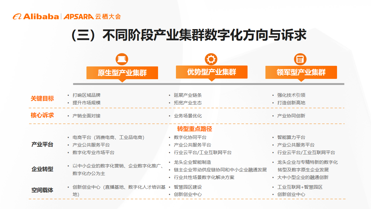 报告按照产业集群的规模、创新能力及区域影响力,将集群划分为原生型集群、优势型集群和领军级集群三类。不同发展阶段和发展类型的产业集群,对数字化转型的诉求不同。原生型产业集群的关键目标是打响区域品牌、提升市场规模,因此其核心诉求是拓展市场渠道,实现产销全面对接;优势型产业集群的关键目标是延展产业链条、拓宽产业生态,因此其核心诉求是推动产业集群资源整合、信息互通,实现业务场景优化;领军型产业集群的关键目标是强化技术引领、打造创新高地,因此其核心诉求是通过产业链的互联互通及创新要素聚集,推动产业协同创新。