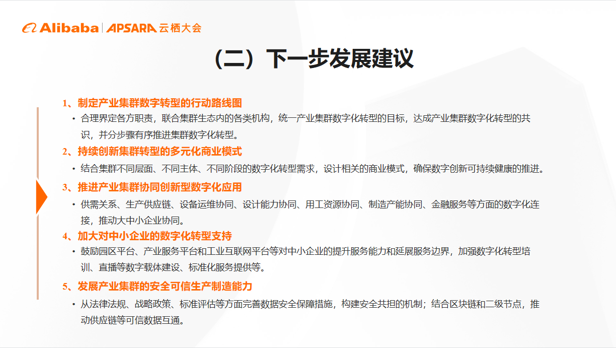 报告预计,产业集群数字创新将呈现本地化、生态化、协同化和普惠化的发展趋势。对此,建议:制定产业集群数字转型的行动路线图,持续创新集群转型的多元化商业模式,推进产业集群协同创新型数字化应用,加大对中小企业的数字化转型支持,发展产业集群的安全可信生产制造能力。