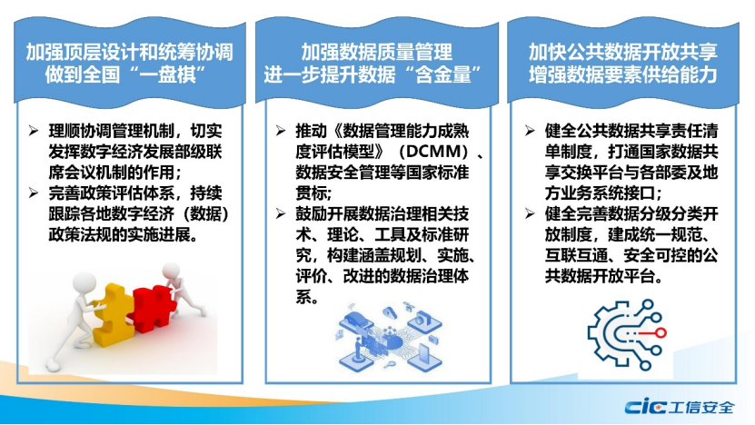 针对这些问题,《研究报告》建议加强顶层设计和统筹协调,做到全国“一盘棋”;加强数据质量管理,进一步提升数据“含金量”;加快公共数据开放共享,增强数据要素供给能力;完善数据交易制度规则,促进数据交易健康发展;建立数据资产登记、评估体系,加快数据资产化发展步伐;完善跨境数据流动规则,逐步提升对外开放水平。