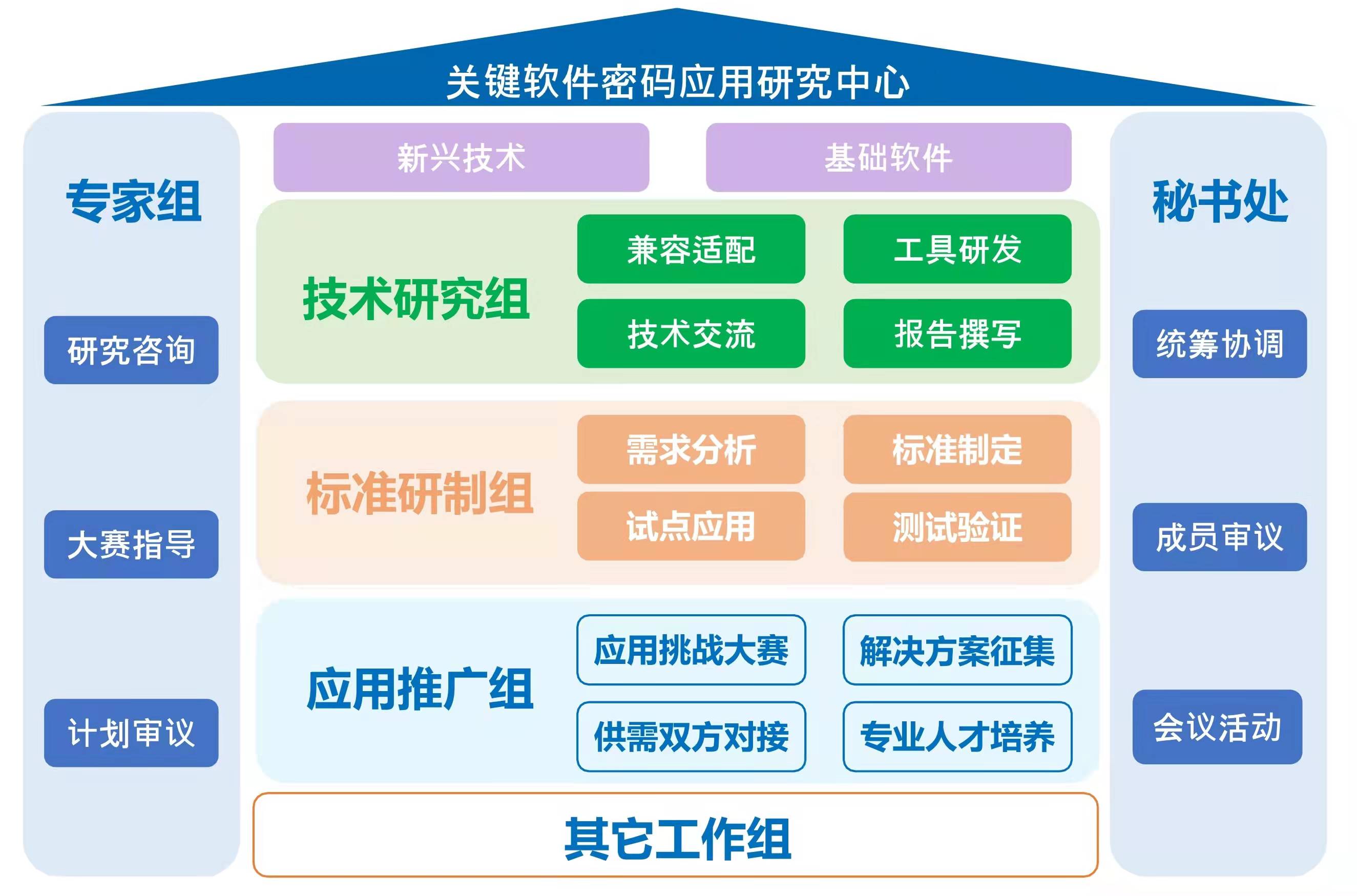 密码中心以推动关键软件领域密码技术应用体系、检测评估认证体系建设为核心任务,通过下设工作组的方式,重点围绕关键软件密码应用技术研究、国产密码和关键软件兼容适配攻关、重点行业试点示范应用、软件密码应用人才培养方向,陆续开展关键软件密码应用方案库建设、关键软件产品密码应用评选、重点行业关键软件适配验证与产品推介等工作。