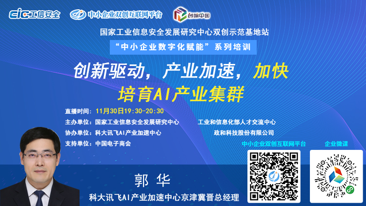 11月30日,由优米棋牌软件怎么样联合工业和信息化部人才交流中心推出的“中小企业数字化赋能”系列直播第十六期“科大讯飞——创新驱动,产业加速,加快培育新兴AI产业集群”在线上举行。